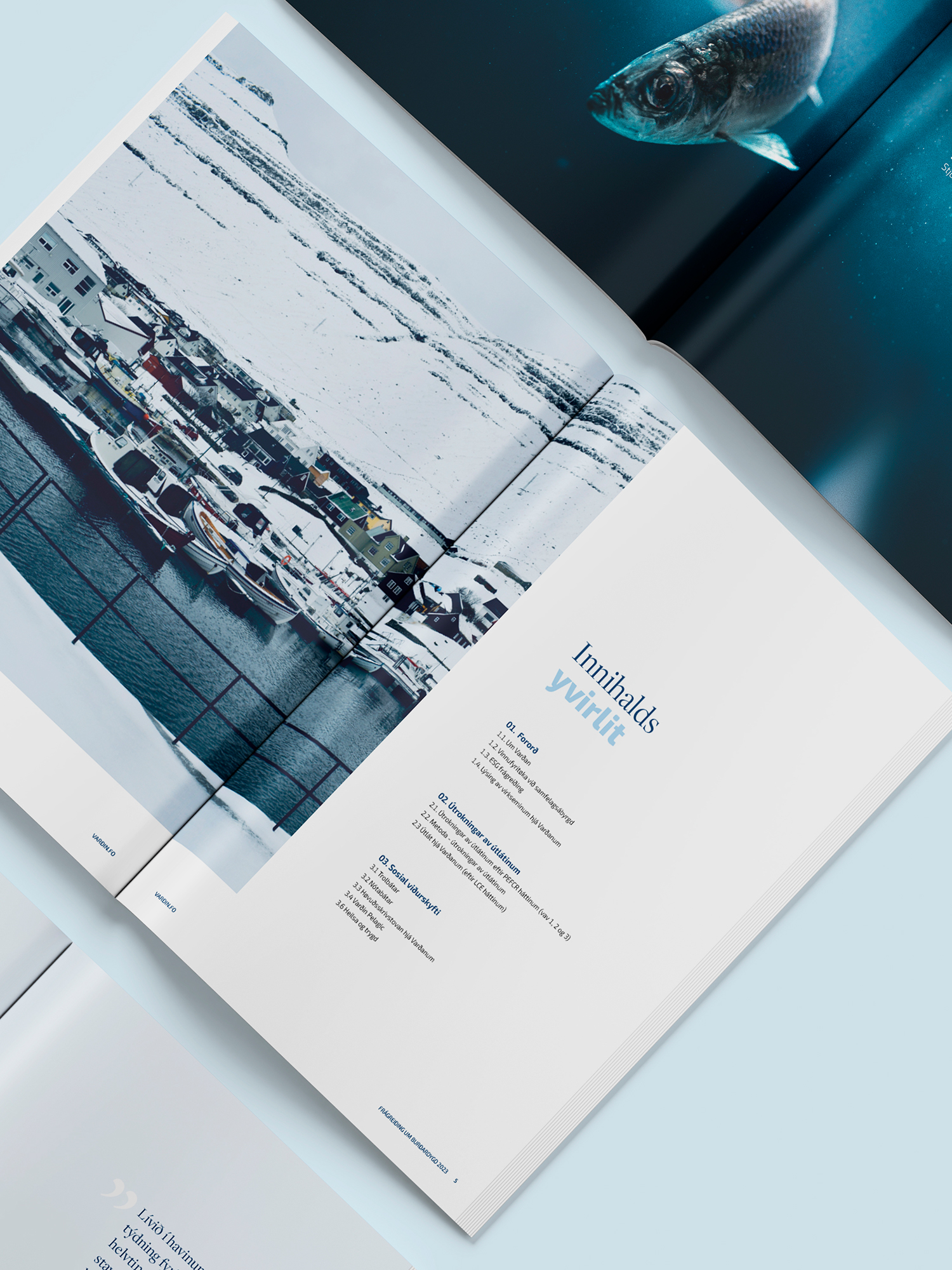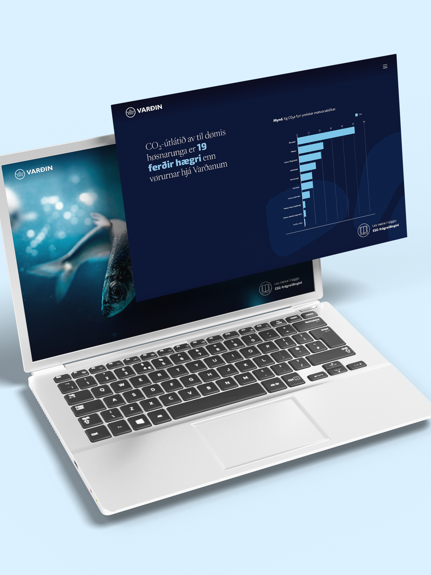 Varðin ger tað rætta. Tey vilja fortelja um tað góða tey gera. Og tey hava gjørt eina serstakliga detaljeraða ESG-frágreiðing har enntá CO2-útlátið av skipabygging er tikið uppí. Hetta er ikki bara vakurt. Hetta selur fisk. Vit hava designað og umbrotið. Og gjørt hesa síðuna, har summir smálutir eru tiknir fram – og frágreiðingin kann lesast í síni heild.